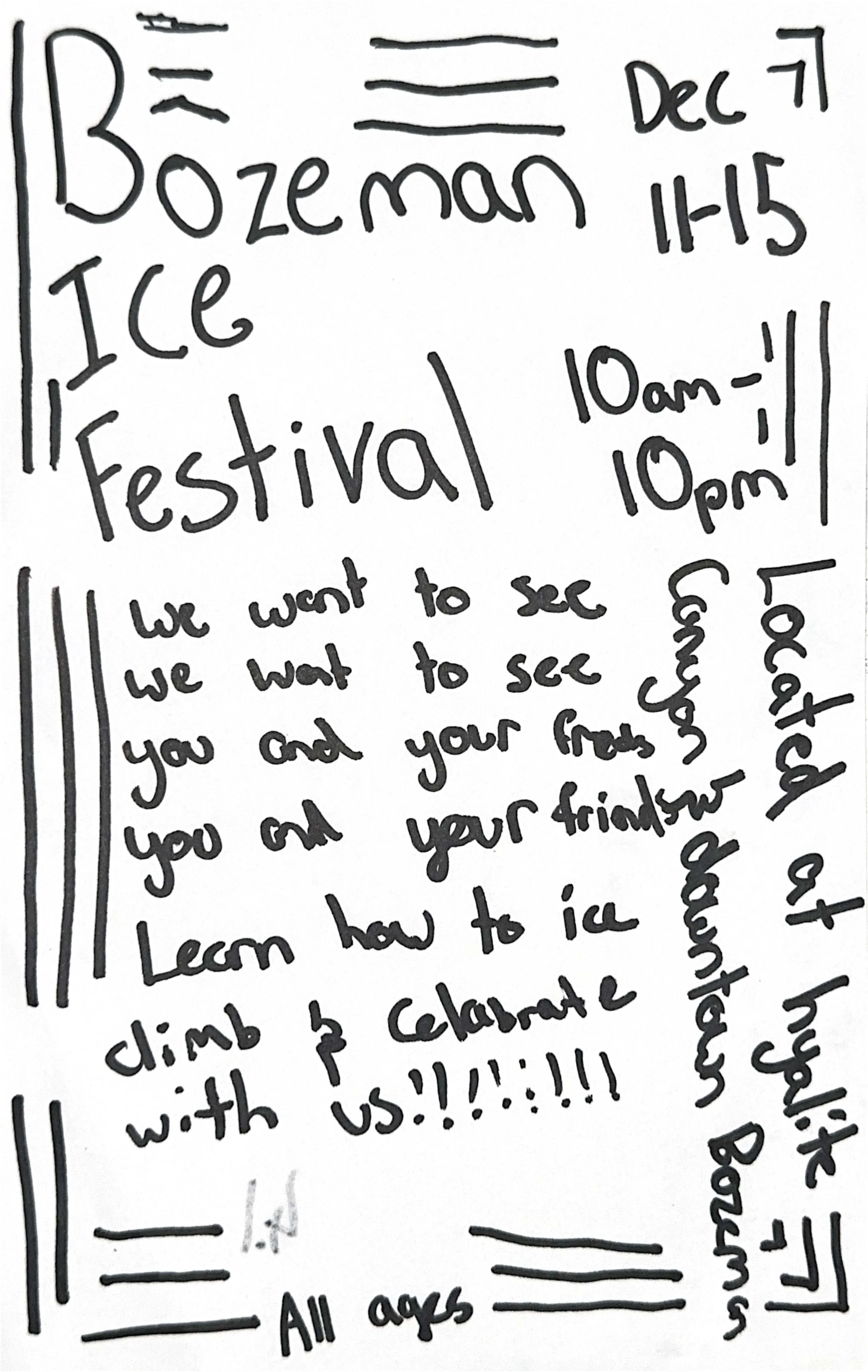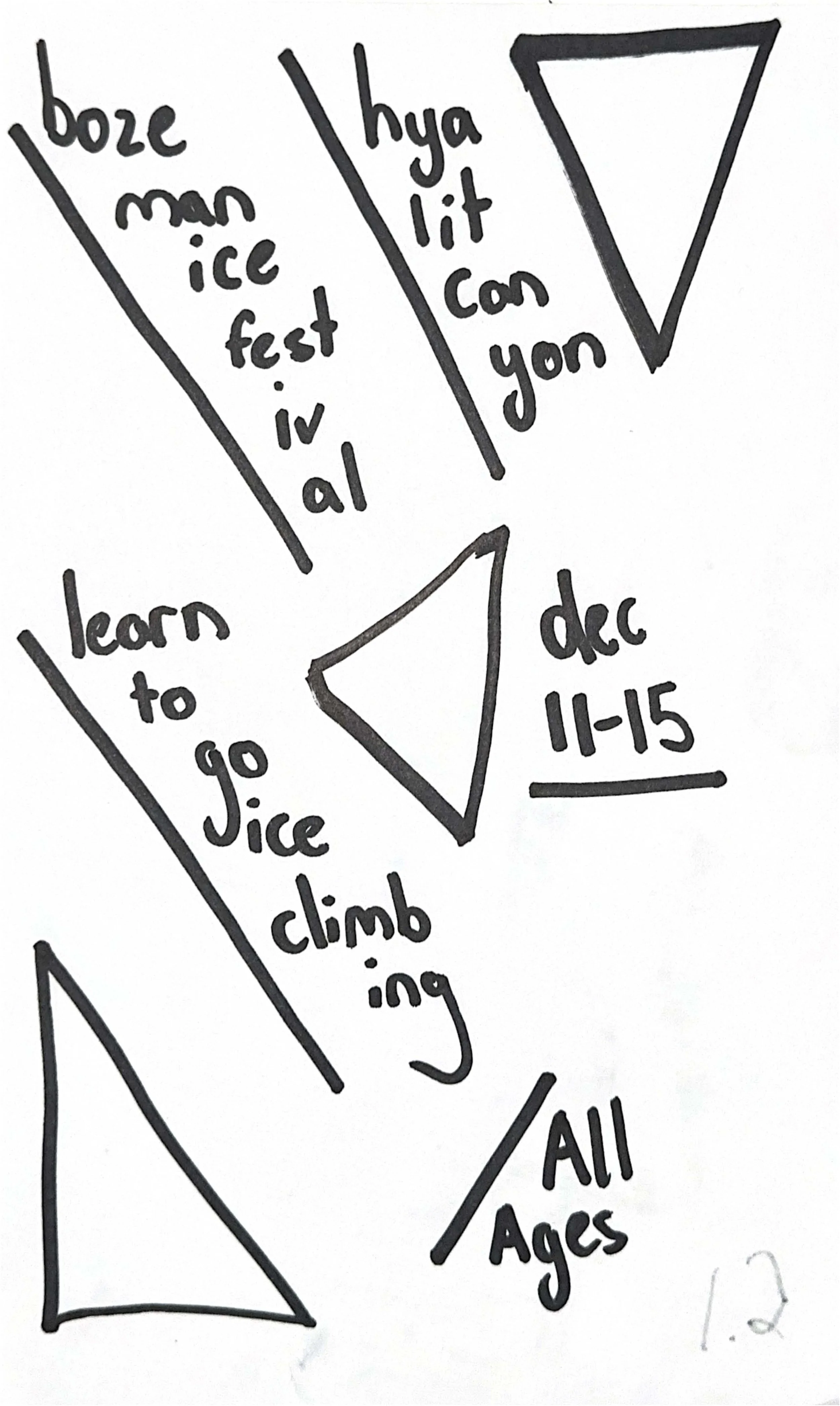This project focused on designing a poster for a festival using a type manipulation feature. I went froward with Bozeman Ice Festival which gets held in Bozeman every winter. I played around with the use of hierarchy, balance, and color to design a final poster. We had designated boundaries to follow which challenged my design process. We were not allowed to use images and had to draw attention with type. Overall Im really proud of the design I made.